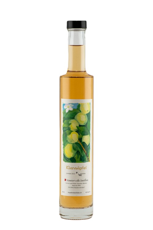 Klara-Apfelbrand, zwei Jahre im Holzfass gereift und mit gedörrten Klara-Äpfeln veredelt. Durch die zusätzliche Frucht entsteht ein besonders intensives, natürliches Apfelaroma.
