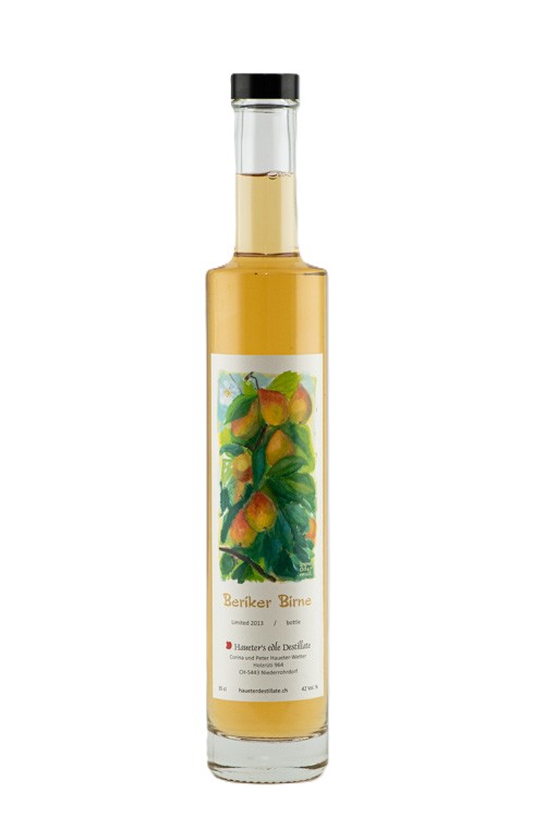 Birnenbrand aus Beriker-Birnen (auch bekannt als Isler-Birne oder Schwärzi-Birne), zwei Jahre im Holzfass gereift und mit gedörrten Birnen veredelt. Durch die zusätzliche Frucht entsteht ein besonders intensives, natürliches Birnenaroma.