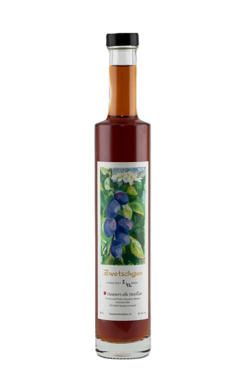 Zwetschgenbrand, zwei Jahre im Holzfass gereift und mit gedörrten Zwetschgen veredelt. Durch die zusätzliche Frucht entsteht ein besonders intensives, natürliches Zwetschgenaroma.